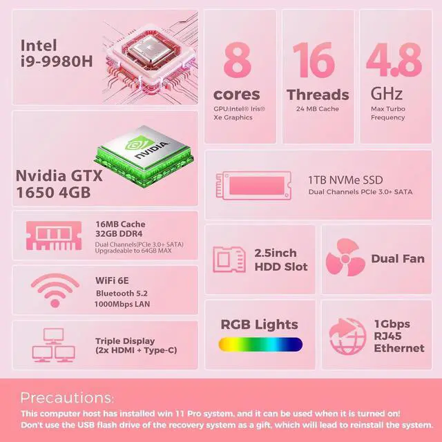 The Gaming PC mini uses High Cooling with a Twin Turbo Smart Fan and copper module Heat Spreader, and mini computer sound under 38 dB. Pink mini pc, pick up your girly dreams, 7 colors rainbow RGB lights show a very beautiful and Cool color effect | Mini PC Pre-in Windows 11 pro, No Bloatware, boots up in seconds