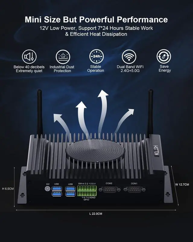 Optional WIFI6 BT 5.2S ystemPreinstall Windows 11 Pro, support Windows 10, Linux etc. LanguageEnglish as defaulted (Support pre-installed designated language system )Case MaterialAluminum AlloySize & Weight 8.60 x 5.00 x 2.36 inches ( 2.53 lb) 1Core-i5-10210U Processor2RAM & Storage3Triple Displays4WiFi & BT5Multiple Systems1Multiple Ports2Multiple Functions3Installation Diversity4Packing List HISTTON FH6 Industrial Mini PC with Cooling Fan