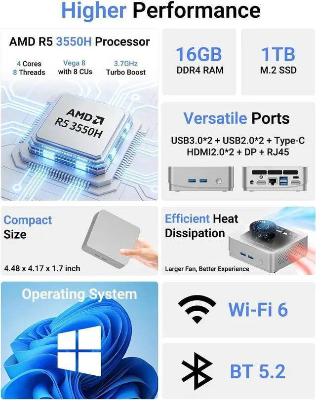 Powerful AMD Ryzen 5 3550H QuadCore, EightThread Beast Unleash serious performance with the AMD Ryzen 5 3550H processor (up to 3.7GHz) inside this mini pc. Based on the efficient 12nm Zen+ architecture, this quadcore, eightthread CPU delivers desktopgrade muscle for demanding multitasking, light video editing, and even casual gaming. With a configurable TDP of 35W, it outperforms many lowpower chips while still keeping your electricity bill low. This Mini Computer transforms from a daily driver into a creative workstationsmoothly handling large datasets, coding environments, and HD photo editing.