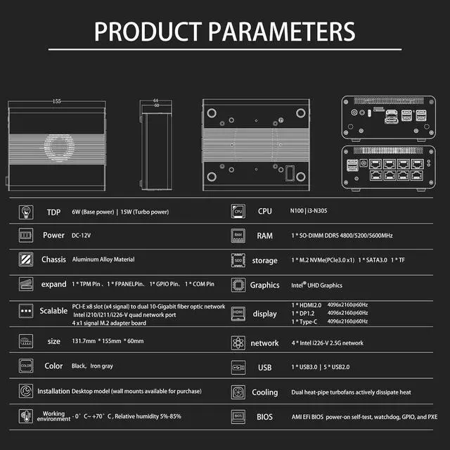 ?Professional Firewall & NAS SERVERMOGINSOK 10gbe Firewall Appliance Mini PC-MGNASN, a powerful professional firewall router pc equipped with a 12th Gen Alder Lake N100 4C/4T up to 3.4GHz TDP only 6W with Intel UHD Graphics which maximizes the performance of the 2.5GbE port & SFP+ port, bring you a smooth secured and encrypted network environment.