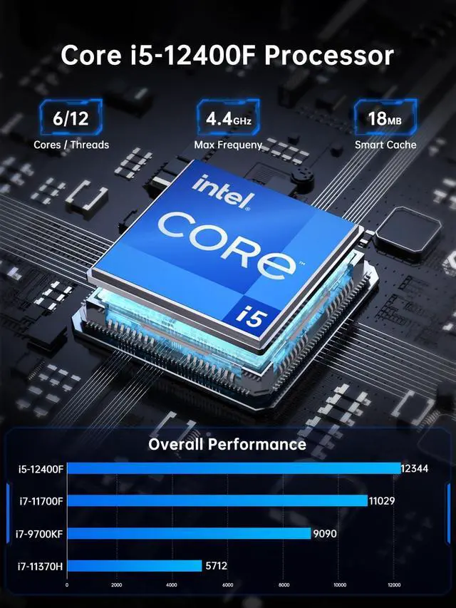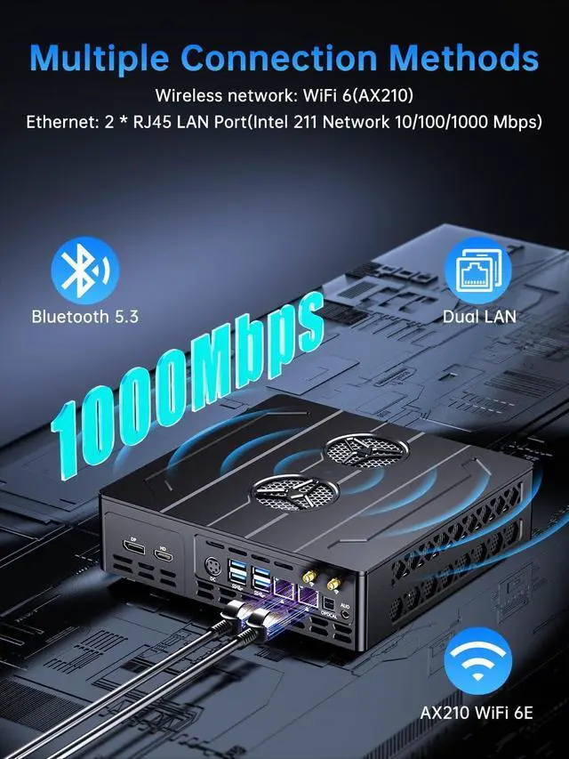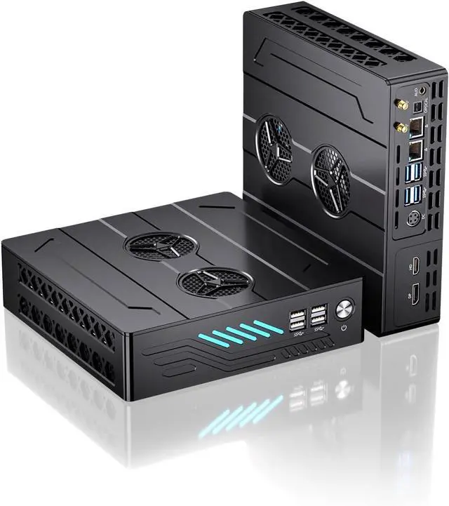 CPU: CORE i9-12900F GPU: RTX3050 6G/RTX4060M 8G RAM: DDR5 Dual Channel(SODIMM Slot x2, up to 4800MT/s, MAX 96GB) Storage: 1 x 2280 M.2 NVME PCle 4.0 SSD Slot, max 4TB. 2 x SATA Slot, support 2.5 inch SATA 3.0 SSD/HHD, max 4TB. System: Win 11 Pro(Compatible with Win 10Pro, Linux,Ubuntu) BIOS: AMI BIOS, supports ACPI. Video output: Dual Screen Display, HD 2.0 + DP 1.4(RTX3050/4060M Support 8K) Wireless Connectivity: WiFi 6E & BT5.3 (AX210) Ethernet: 2 x RJ45 LAN Port(Realtek RTL8111 Network 10/100/1000 Mbps) Audio: ALC892 sound chip, 7.1 channel Realtek HD audio I/O Ports: 4 x USB2.0 Type-A Port 4 x USB3.2 Type-A Port 1 x HD 2.0 1 x DP 1.4 2 x RJ45 LAN 1 x Optical 1 x Audio Jack 2 x WiFi Antenna 1 x 19V DC Input Cooling system: All-copper turbine fan Size: 210*210*55mm(8.26*8.26*2.16 inch) Weight: 2.0kg(4.41lb)