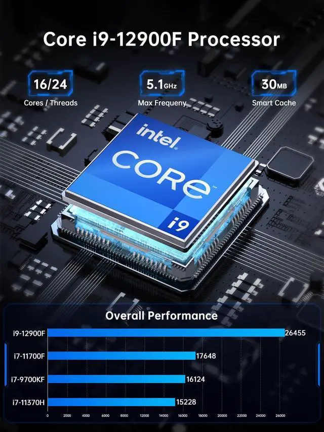 [Powerful Performance] Thdeukoty MV9 mini pc is equipped with Core i9-12900F processor, 16 cores/24 threads, 30MB smart cache and frequency up to 5.1 GHz, as same time powered by NVIDIA RTX3050 6GB graphics, so MV9 delivers exceptional multitasking and computing power for demanding tasks from 4K content creation to AAA gaming.