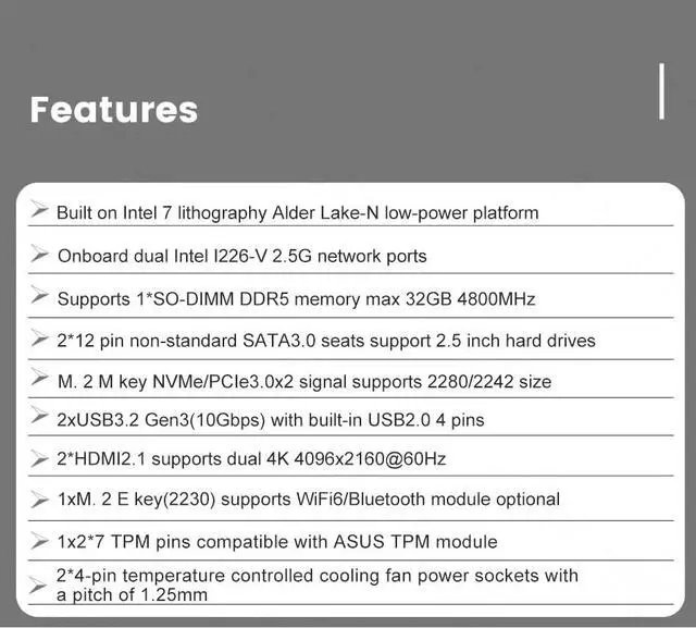 Dual 2.5GbE LAN: Mini Router PC with 2*I226 network card chip full UDE 2.5G with filter connector.Soft Router can monitor network data, improve network security, powerful and widely used.1 M.2E key (2230) supports WiFi 6/Bluetooth module expansion