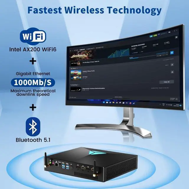 Mini computer built-in WiFi 6(802.11AX) and Bluetooth 5.1, support wireless Gigabit, transmission speed up to 2.4Gbps, enable faster and more stable without network congestion.