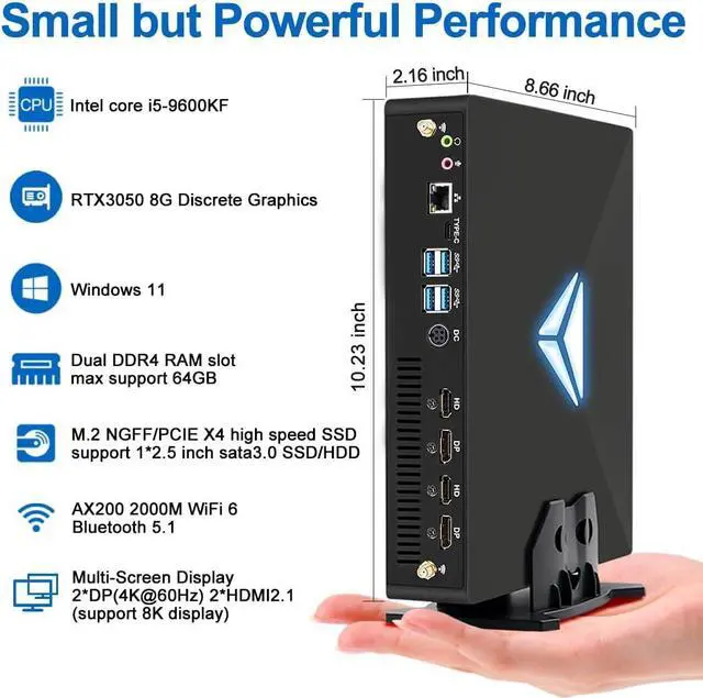 CPU ProcessorCore I5-9600KF, 6 Cores 6 Threads, 9M Cache, Processor Base Frequency: 3.7GHz (up to 4.6GHz)MotherboardB360 all solid-state motherboard with TPM2.0 moduleDiscrete GraphicsGeForce RTX3050 8G with ray tracing, memory frequency: 14000MHz, 8GB GDDR6, 128bit.O/SPre-installed Windows 11 Pro, Also support Windows 10 pro, Linux, ubuntu, CentOS.RAM2 x so-dimm RAM DDR4 slot, max support 64GB.SSDM.2 NVME SSDHDDSupport 1 x 2.5 inch sata 3.0 SSD/HDDWireless TechnologyBuilt in AX200 WiFi6 & Bluetooth 5.1Gigabit LANIntel255 2.5G network card, supporting RJ45 100M/1000MVideo Output2*HDMI+2*DP support 4-screen display output, HDMI support 4K HD output, DP 1.4a support 8K HD outputAdditional FunctionsSupport 24 hours boot, Wake on LAN, Auto Power onEfficient Heat DissipationInside the chassis are four all-copper turbo fans and eight vacuum heat pipes for powerful cooling performance.Package Including1*Mini Computer, 1*HDMI Cable, 1*DP Cable, 1*Bracket, 1*AC Adapter with Cable, 2 * External Antennas Mini PC comes with Core i5-9600KF processor (6 Cores 6 Threads, 9M Cache), 14nm Lithography Technology. Burst Frequency 4.6GHz. High-Performance Processor (A fast & smooth and power-saving mini PC, Designed specifically for large gaming, office work, education, light gaming and industry, home theater pc.)
