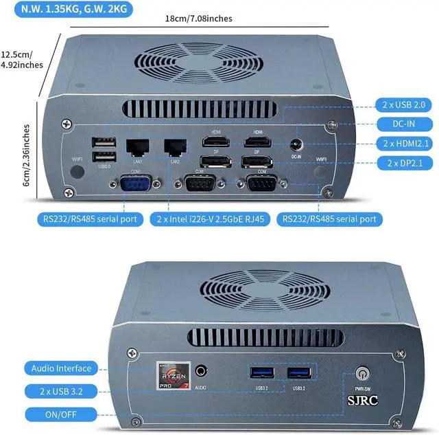 I/O Interface: 1 x RS232/RS485 Serial Port, 2 x RS232 Serial Ports, 2 x USB 3.2, 2 x USB 2.0, 2 x HD 2.1+ 2 x DP 2.1 for 4 screen 8K@60Hz or 4K@120Hz, 1 x DC IN, 1 x Audio port, 1 x Power Button