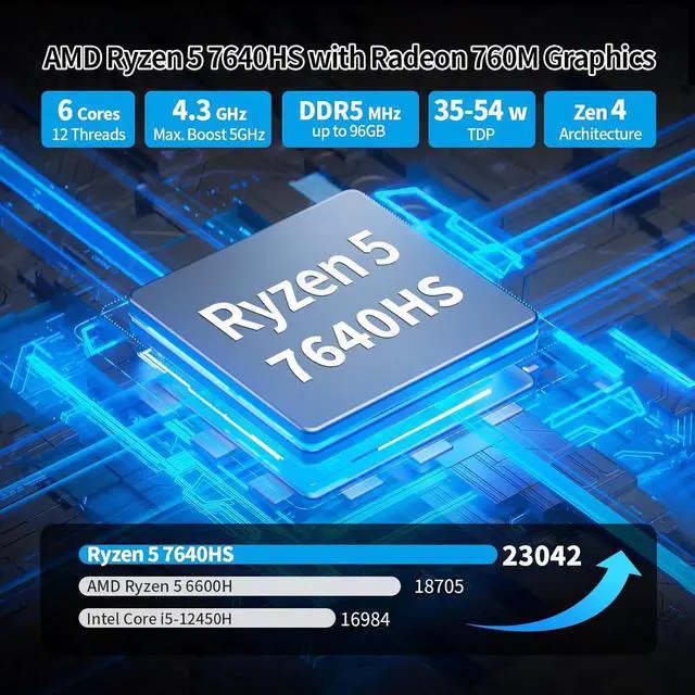 CPU: AMD Ryzen 5 7640HS processor, 6 Core 12 Threads, up to 5.0GHz, 16MB L3 Cache, 35-54W TDP