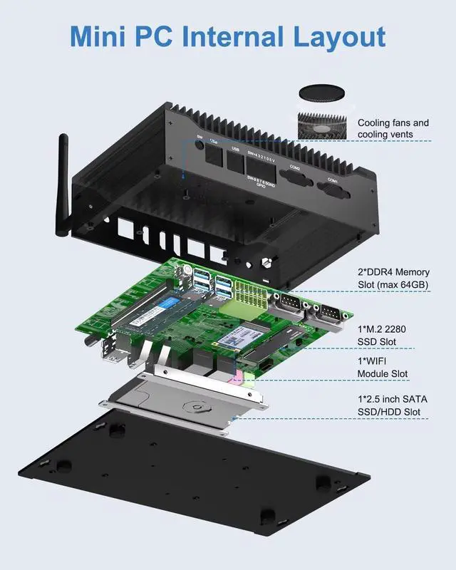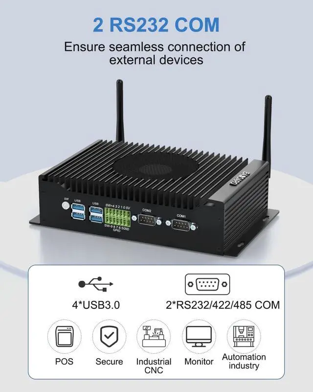 CPUCore i7-10510U Processor (4 Cores 8 Threads, Base Frequency 1.80GH z, up to 4.9GH z)GraphicsUHD GraphicsMemory2 x DDR4 SO-DIMM memory slots, up to 64GB RAMStorageSupport 1 x M. 2 2280 SSD, 1 x SATA 3.0 for 2.5 inch HDD/SSDLAN2 x RJ45 LANDisplay1 x HD 1.4 4K 30Hz, 1 x HD 2.0 4K 60Hz (video only), 1 x DP 1.2 4K 60HzUSB4 x USB 3.0, 2 x USB 2.0COM 2 x RS232 COM (support RS232/RS422/RS485)GPIO1 x 14 pin GPIO (default GPIO 0-4 Output, GPIO 5-9 Input)WiFi & BTDual Band WiFi + BT; support 3G/4G Module (not included) and SIM Card (not included) Power12V 6A, DC 5.5 x 2.5MMO perating SystemWin 11 Pro, Win10 Pro, LinuxSize & Weight220mm x 127mm x 60mm / 8.66 x 5 x 2.36 inches; 1.15 kg / 2.53 lbCase MaterialAluminum Alloy + Cooling Fan, Efficient heat dissipationOther FunctionsSupport Auto Power On, Wake on LAN, PXE (Legacy), WatchdogBios Setup/Boot MenuDelete key to enter Bios Setup, F11 key to enter Boot Menu 1Powerful Performance2Extensive Port3Expandable RAM & SSD42 RJ45 LAN BASOARO Rugged Industrial PC Mini PC Win 11 Pro Specification