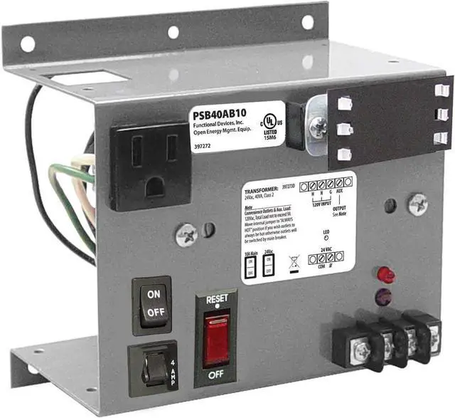 Functional Devices PSB40AB10 Single 40 VA Power Supply, 120 Vac to 24 Vac, 10 Amp Main Breaker, Open Bracket Panel Mount, Metal Enclosure