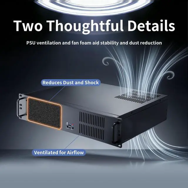 Cooling and Dust-proof Design2u server chassis designed with enhanced ventilation architecture and strategically placed perforations, this chassis ensures optimal airflow to prevent critical components from overheating during extended operation. The unique front panel is lined with high-density foam, which not only minimizes fan vibration and resonance for whisper-quiet performance but also acts as an effective dust filter, protecting internal hardware and ensuring long-term system reliability.