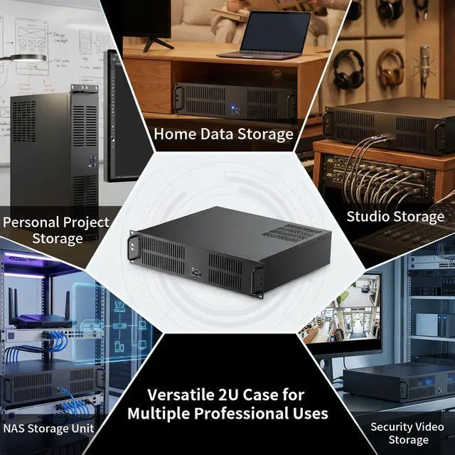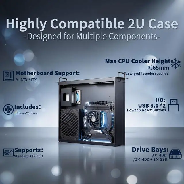 Broad Hardware CompatibilityThis versatile 2u server case, compatible with Mini ITX and Micro ATX motherboards (up to 9.6"x9.6"), standard ATX power supplies, GPU up to 11.4" in length, and low-profile CPU coolers (65mm height) for efficient, space-saving configurations.