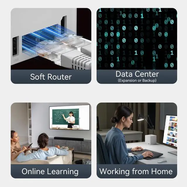 Multiple interfaces & functions: The mini PC adopts independently designed heat dissipation technology and runs almost noiseless at the same time. The mini computer has a unique interface designed with 2 x RJ45 ports (for soft routing), 1 x HDMI port, 1 x USB 3.2 10Gbps, 1 x USB 2.0 (Always On Support), and 1 x Type-C (10Gbps) port. Supports connecting monitors, projectors, mobile phones, and other devices. In addition, this computer supports LAN wake-up, automatic boot, and PXE boot. Meet your various needs.