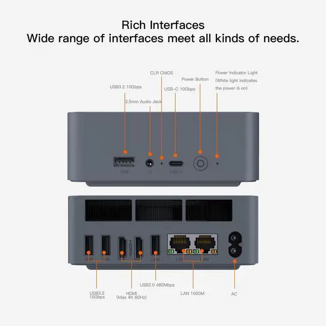 • Multiple Interfaces & PSU 85WBeelink Mini PC has a unique interface designed with 3 x USB 3.2 Gen2(10Gbps), 1 x USB 2.0 480Mbps, 1 x Type-C(data,10Gbps), 2 x HDMI(Max 4K 60Hz), 1 x AC Jack, 2 x RJ45 R