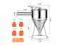 The batter dispenser set contains: 1 x pancake dispenser for batter with stand, 1 x grip handle and 4 x different caliber silicone funnel. Silicone funnel sizes are: 0.31", 0.47", 0.55", 0.67" and the dispenser itself has a 0.75" spout. Capacity: 20oz/40oz