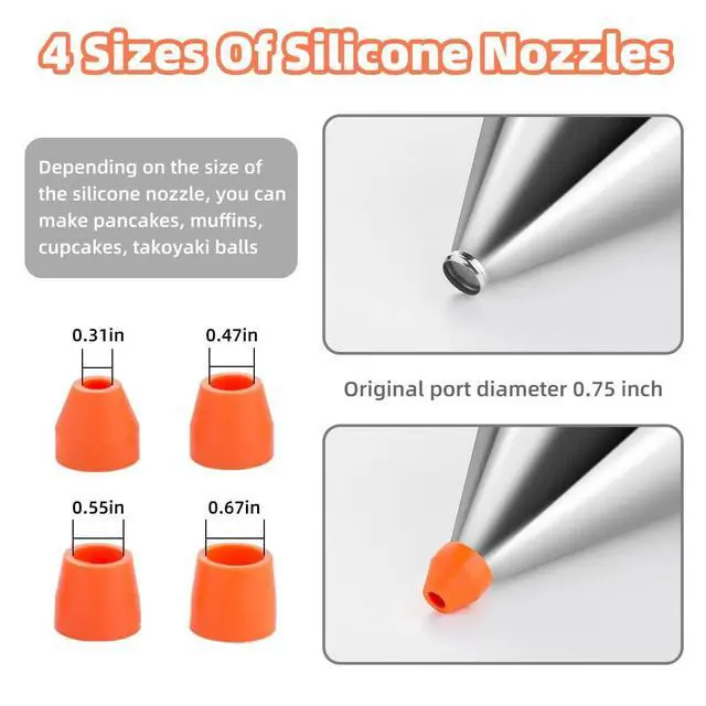 4 different sizes of silicone nozzles allow for different options for dispensing pancakes, crepes, muffin, cupcakes, takoyaki balls.