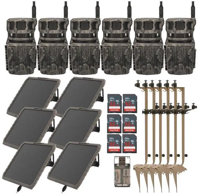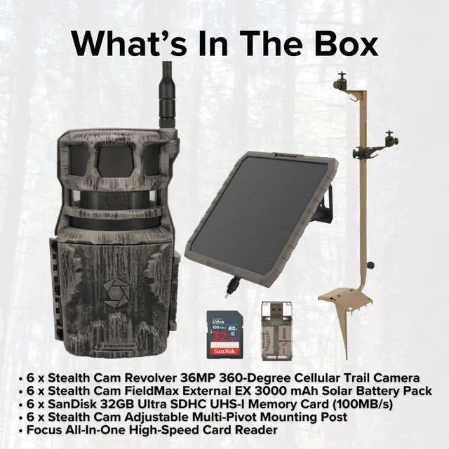 The all new Stealth Cam Revolver 36MP 360-Degree Cellular Trail Camera delivers the equivalent of six cameras worth of coverage in a single device capturing 4MP, 8MP, 16MP, and 36MP photos and 1080 HD video with audio via a revolutionary, 360-degree cellular model that covers six zones to deliver a complete panorama of its surroundings. This means users get a full 360 degrees of visibility, day and night, to ensure they never miss a thing even deer passing behind where the lens is positioned. Plus, thanks to its silent, pivoting motor, you can get more than just one photo from a single vantage when a zone is triggered. The camera responds quickly to deliver high-quality images and videos in real time, making it ideal for use on food plots. Choose from three photo operation settings, including: single-zone capture, 180-zone capture and 360-zone capture. Four power LEDs boast a whopping 80-foot detection range which, when paired with the 0.4-second trigger speed, burst mode and timelapse capabilities, provide reliable updates in real time, 24 x 7. Thanks to the integrated GPS, the camera shares its coordinates with you. Powered by a 16pc dual cartridge battery, it features a 1/4-inch threaded mount, 12V DC auxiliary jack and optional t-post mounting bracket (included). Includes Command Pro app compatibility.