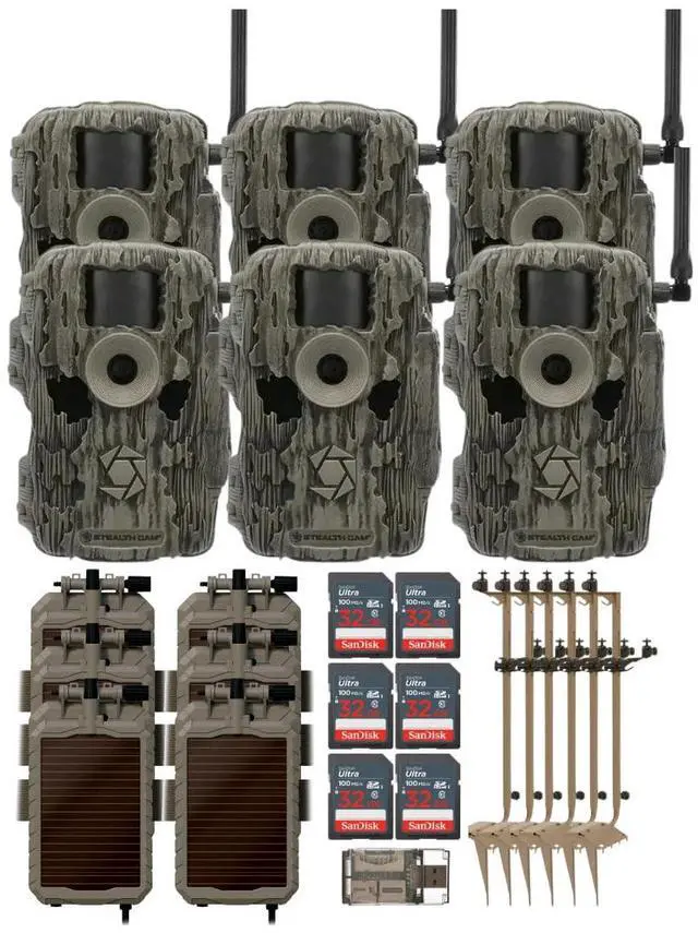 Stealth Cam 36MP Fusion Max Cellular Trail Camera with Infrared Flash (6-Pack) Bundle with Solar Power Panel (6-Pack), Mounting Post (6-Pack), 32GB Memory Card (6-Pack), and Card Reader (25 Items)