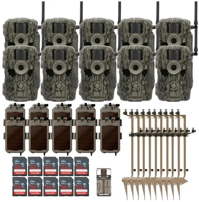 Stealth Cam 36MP Fusion Max Cellular Trail Camera with Infrared Flash (10-Pack) Bundle with Solar Power Panel (10-Pack), Mounting Post (10-Pack), 32GB Memory Card (10-Pack), and Card Reader (41 Items)
