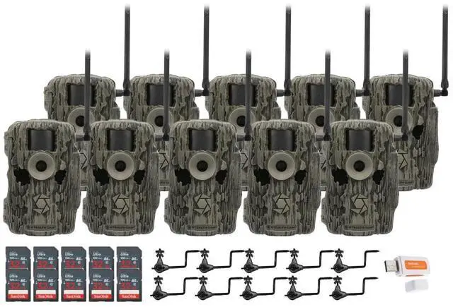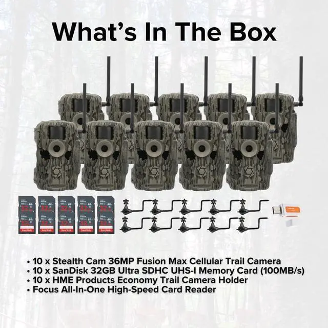 Stealth Cam 36MP Fusion Max Cellular Trail Camera with 80 Feet Detection Range (10-Pack) Bundle with Camera Holder (10-Pack), 32GB Memory Card (10-Pack), and Hi-Speed SD USB 2.0 Card Reader (31 Items)