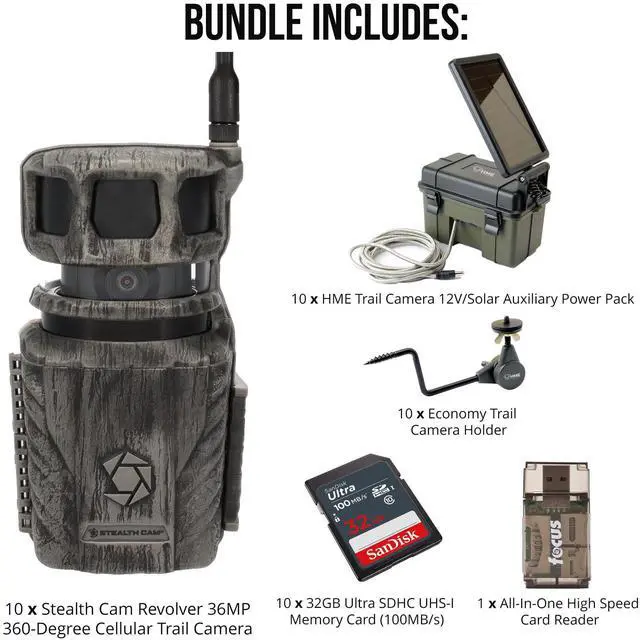 | Included Components | High Speed SD USB 2.0 Card Reader, Trail Camera 12V Solar Auxiliary Power Pack, Stealth Cam Revolver 36MP 360-Degree Cellular Trail Camera with 1/4-Inch Threaded Mount, 32GB Memory Card, Economy Trail Camera Holder |