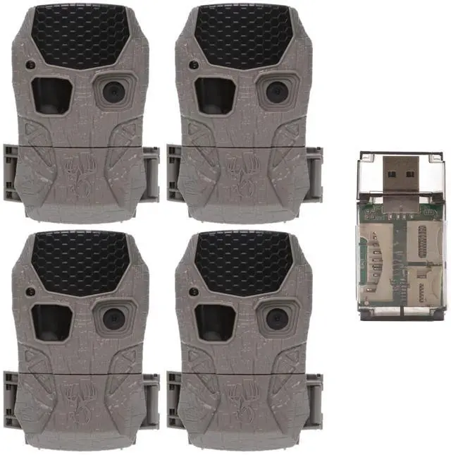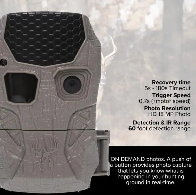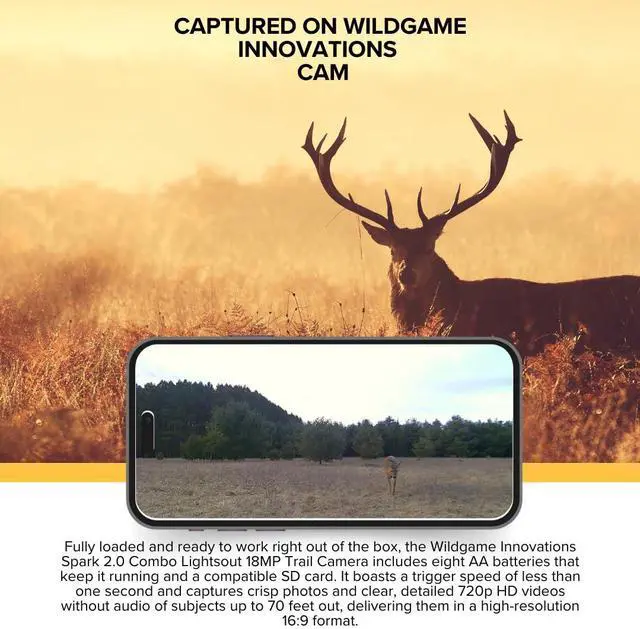 Now available with a higher 18MP resolution, the Wildgame Innovations Kicker 2.0 Lightsout Trail Camera boasts a rapid trigger speed (under one second) to capture crisp, high-quality photos and 720p HD videos up to 15 seconds long (without audio). 36 invisible black LEDs illuminate subjects as far out as 60 feet in a 16:9 ratio image format. It features time, date, and moon phase stamp selections. It is powered by eight AA batteries (not included). The trail camera includes an adjustable tree strap with alligator-style clips. The cable-lock-ready latch (security accessories not included) helps deter theft.