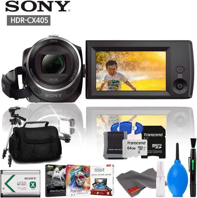 The Sony HDR-CX405 HD Handycam features an Exmor R CMOS sensor and a wide-angle Carl Zeiss zoom lens with 30x optical zoom. The CX-405 captures Full HD 1920 x 1080 video at 60p and 9.2MP still images to optional Memory Stick Micro and microSD/SDHC/SDXC media cards. The Exmor R CMOS sensor is designed for increased sensitivity in low light situations and the Optical SteadyShot image stabilization with Intelligent Active Mode delivers smooth video. Users can monitor and playback footage via the 2.7" LCD display with 230K dot resolution.