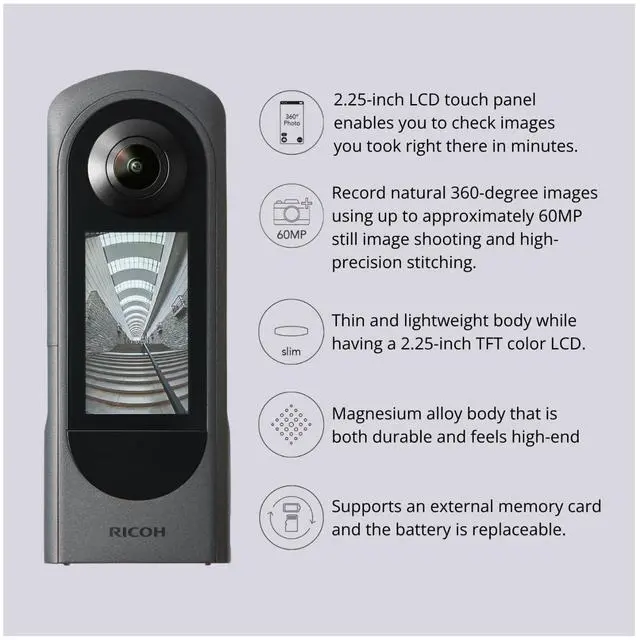 First in the THETA series with a removable DB-110 battery and microSDXC card support in addition to 46GB internal memory.