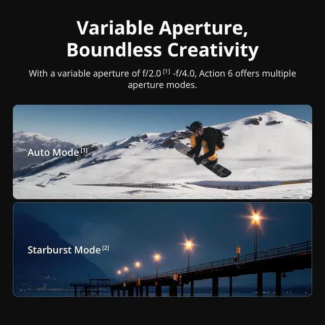 Capture Every Scene, Day or Night - Variable aperture f/2.0 [1]f/4.0 adapts for crystal-clear 4K footage in any light. Great for dynamic vlogs, sports, and creative shots with your action camera.
