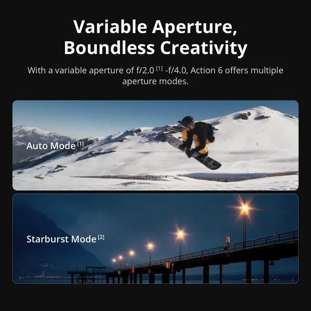 DJI's First Variable Aperture Action CameraAs DJI's first action camera with a variable aperture of f/ 2.0 -f/ 4.0, Osmo Action 6 breaks away from the traditional fixed-aperture design and offers aperture modes that suit a wide range of scenarios. Larger Aperture, Boundless CreativityWith a maximum aperture of f/ 2.0, Osmo Action 6 excels in low light, delivering noticeably enhanced image quality. Pair it with the Macro Lens to capture stunning close-ups of food, pets, and more with a beautiful shallow depth of field at closer shooting distances. Adaptive Aperture, Defined by YouIn Auto mode, choose from multiple aperture ranges that suit your needs.
