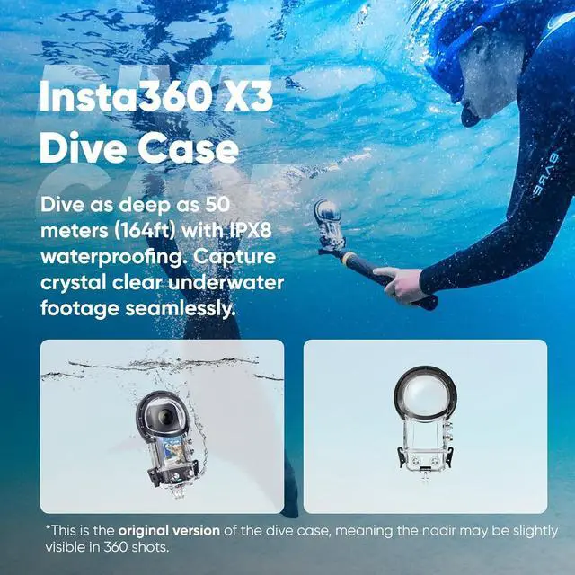 Epic Accessories for Watery Fun: Embark on your water adverntures with the Insta360 X3 Dive Kit! Dive deep into the sea, up to 164ft with the IPX8 waterproof Insta360 X3 Dive Case (* ). Grab the Floating Hand Grip to keep the X3 in your hands. Let it go and watch iit float up to the surface with ease.
