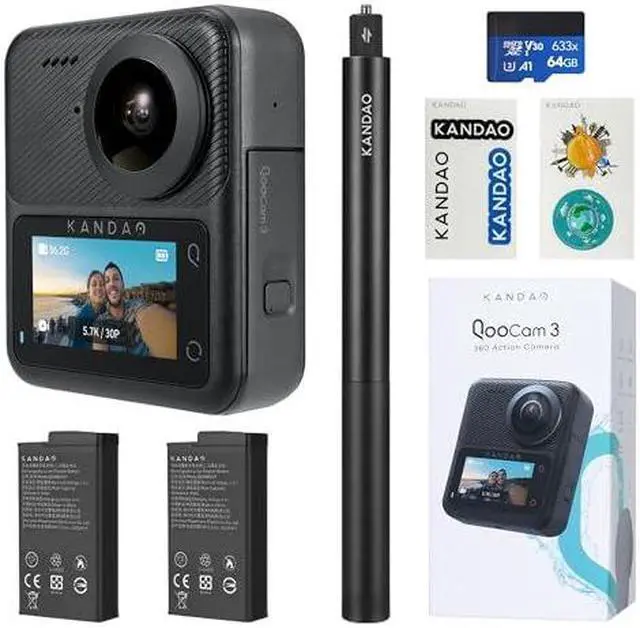 - KanDao QooCam 3 360 action camera, equipped with two ultra-wide-angle fisheye lenses, it captures in 360 degrees with ultra-high-definition image quality and records brilliant 5.7K/62MP image, capturing immersive panoramic contents without missing any moment. From vlogging, biking, and traveling to skating, QooCam 3 delivers 60fps captivating shots.. - Featuring a wide F1.6 aperture and two 1/1.55" sensors with 2um pixel size, QooCam 3 sports camera captures abundant light, enhancing details in darker regions even in low light conditions, and delivering clear, refined images.. - With a built-in six-axis gyroscope, QooCam 3 action camera eliminates the need for a stabilizer during activities like handheld shooting, pet tracking, mountain biking, and off-road racing. QooCam Studio enables seamless 360° horizontal correction, ensuring picture shoots remain stable and perfectly level, regardless of any flips or movements during capture.. - QooCam 3 camera thrives from 0°C to 40°C32°F to