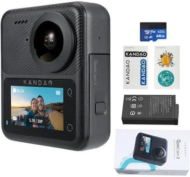 - KanDao QooCam 3 360 action camera, equipped with two ultra-wide-angle fisheye lenses, it captures in 360 degrees with ultra-high-definition image quality and records brilliant 5.7K/62MP image, capturing immersive panoramic contents without missing any moment. From vlogging, biking, and traveling to skating, QooCam 3 delivers 60fps captivating shots.. - Featuring a wide F1.6 aperture and two 1/1.55" sensors with 2um pixel size, QooCam 3 sports camera captures abundant light, enhancing details in darker regions even in low light conditions, and delivering clear, refined images.. - With a built-in six-axis gyroscope, QooCam 3 action camera eliminates the need for a stabilizer during activities like handheld shooting, pet tracking, mountain biking, and off-road racing. QooCam Studio enables seamless 360° horizontal correction, ensuring picture shoots remain stable and perfectly level, regardless of any flips or movements during capture.. - QooCam 3 camera thrives from 0°C to 40°C32°F to