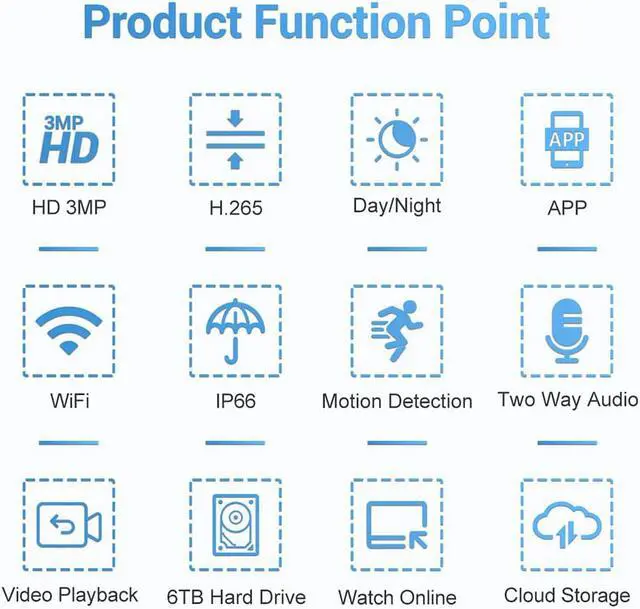 • Two-way Audio:Support two-way Audio,8ch wireless NVR + 8pcs wireless 3MP HD dome camera,support H.265,P2P EseeCloud (APP: EseeCloud);