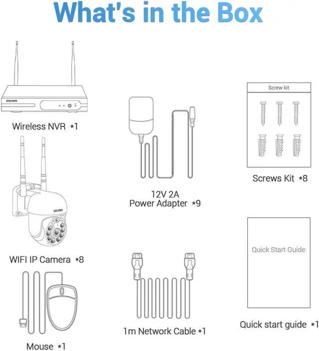 Packing list:8CH WIFI NVR*1, WIFI camera*4, NVR power adapter*1,camera power adapter*4, manual*1, mouse*1, screw pack*4, network cable*1