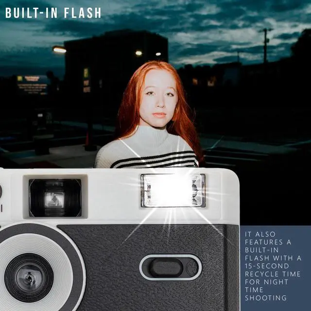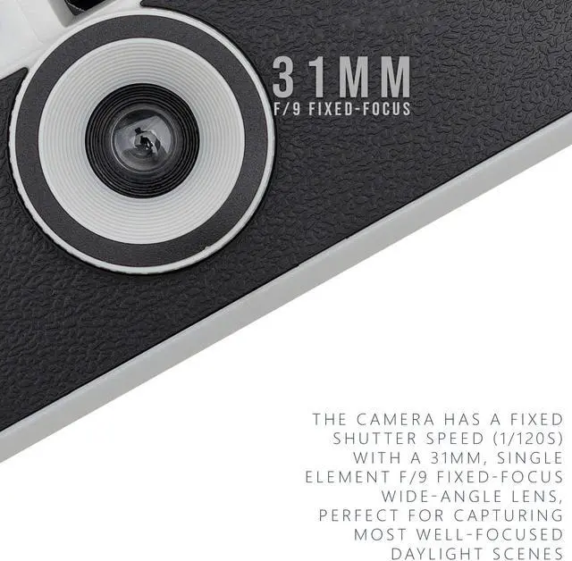 The camera has a fixed shutter speed (1/120s) with a 31mm, single element f/9 fixed-focus wide-angle lens, perfect for capturing most well-focused daylight scenes, and also features a built-in flash with a 15-second recycle time for nighttime shooting.