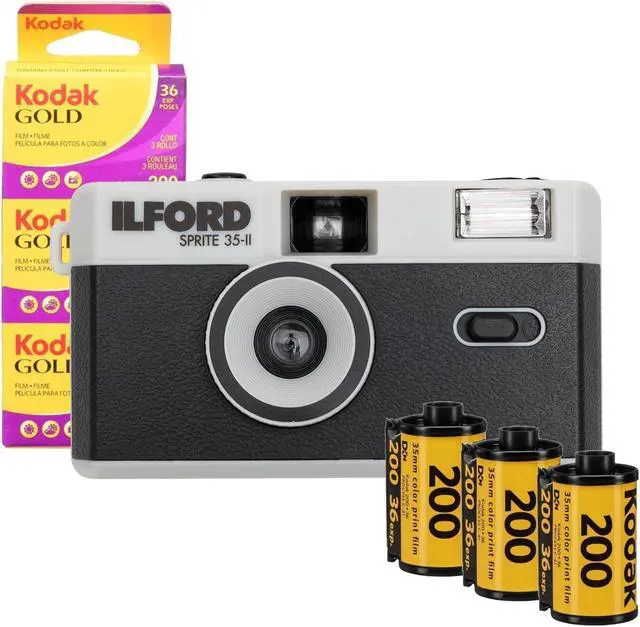 • Bundle Includes: Ilford Sprite 35-II Reusable and Reloadable 35mm Analog Film Camera (Black and Silver) and Gold 200 Yellow and Purple Film with 35mm Film and 36 Exposures (3-Pack)