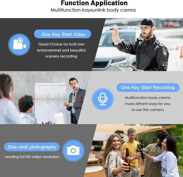 - [Snapping + Loop record + Motion record + Audio record ]Mini Camera work with 4 types modes . Single shooting / continues shooting without missing beauty moment ; Loop recording keep all time in mind ; Motion record save memory and save excited time ; Audio record for more battery life . This HD camera means much more time and energy free than body camera of other brands do.