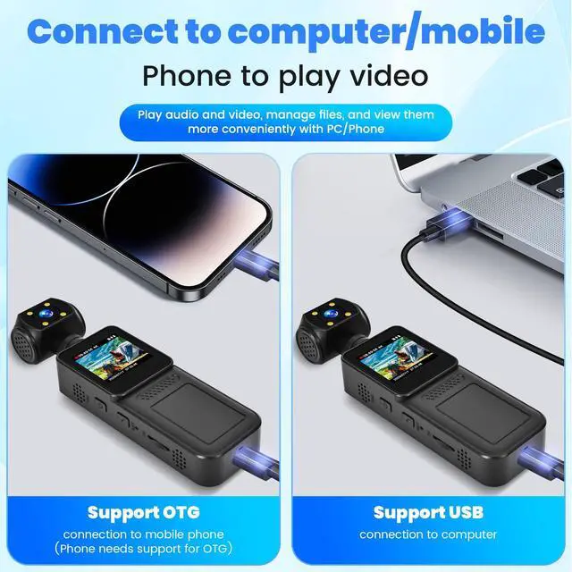 WiFi Support & Real-Time MonitoringPocket Body Cam connects to your smartphone via WiFi for live streaming, remote control, and instant video playback. Easily transfer files or share footage without cables (iOS/Android compatible).