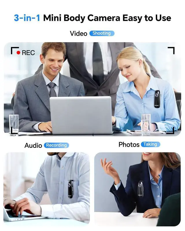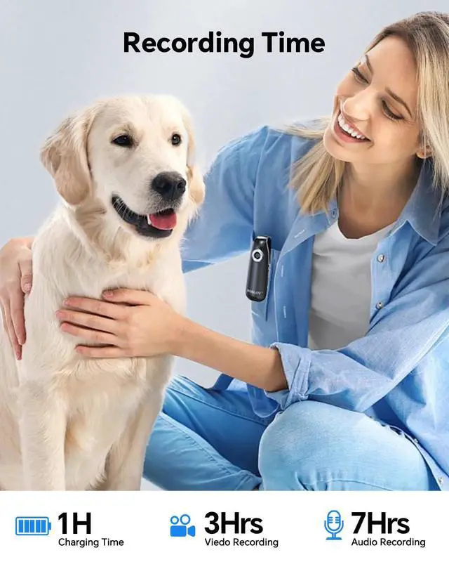 The camera features an integrated design that stays securely in place on clothing. It also includes a magnetic back clip for mounting on metal surfaces.