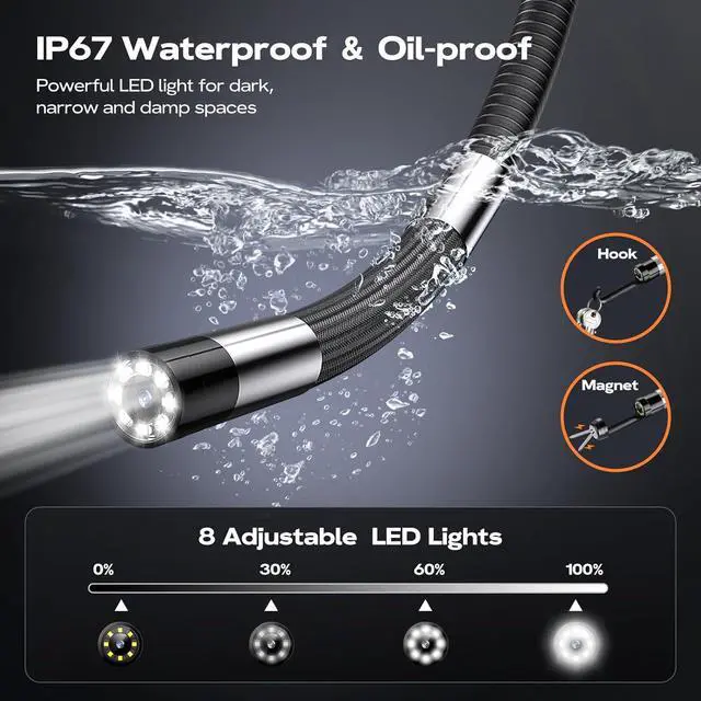 IP67 Waterproof & Adjustable LED LightsThis endoscope camera with light is IP67 water and oil resistant, making it ideal for wet pipes or oil-filled areas.The three-level adjustable LED light design allows you to adjust the brightness according to different inspection conditions to ensure clear visibility