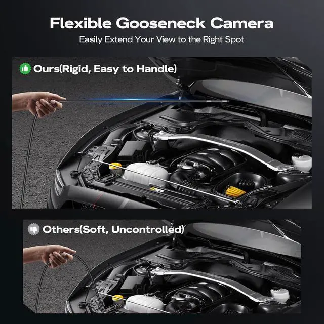 5.5FT Flexible Semi-Rigid Gooseneck CableThe flexible yet sturdy gooseneck snake camera allows easy access to hard-to-reach areas while maintaining its shape. Ideal for reaching deep into car engines, behind walls, or into narrow pipes