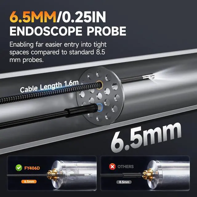 Reach Where Others Can't Save Hours of DisassemblyStop tearing things apart just to see what's inside. Equipped with an ultra-slim 6.2 mm probe, the Y400 borescope accesses spark plug holes, injector ports, and narrow HVAC passages that standard 8 mm+ borescopes can't touch. Get straight to the problemno guesswork, no unnecessary labor. Your time is money, and this inspection camera helps you save both.