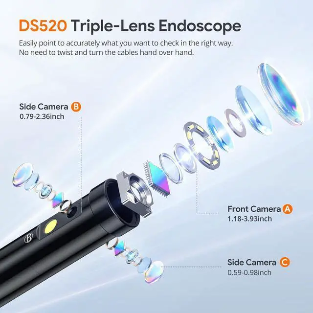 Upgraded Triple LensDEPSTECH DS520 triple lens inspection camera with split screen feature allows you to obtain different focal lengths for an all-round view of the front and sides, providing more viewing angles and proper directional guidance, reducing the amount of work required to twist cables. Help you identify the cause of the problem quickly and accurately
