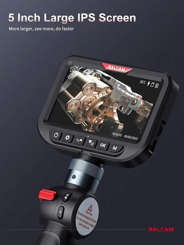 5" IPS Screen with High-Resolution ImagingThe extra-large 5 inch borescope provides a vivid real-time, clear and detailed view. Capture high-resolution images and videos, allowing you to document inspections for further analysis or reporting