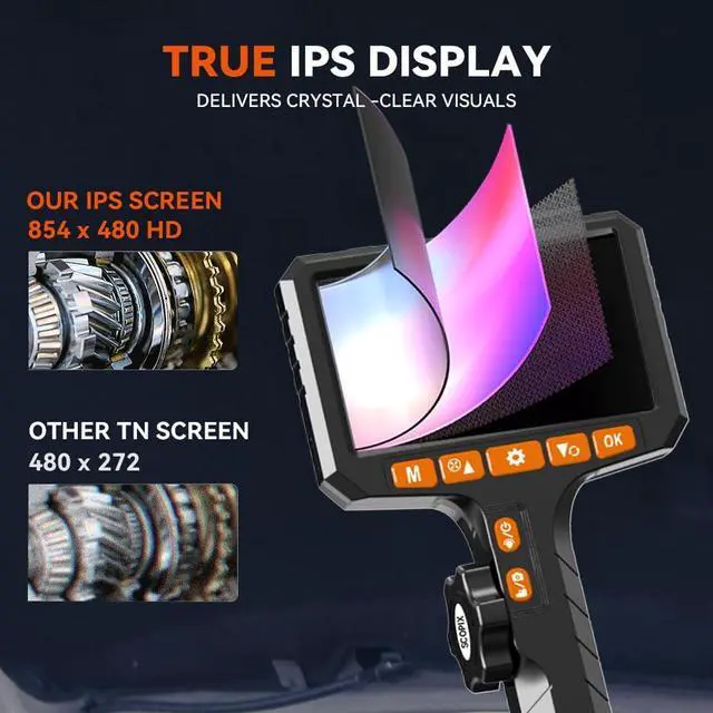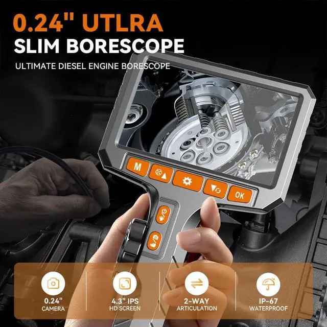 Upgraded Ultra-Thin Flexible Probe Boroscope: Featuring an upgraded 0.24-inch ultra-thin flexible probe and a durable 5-foot metal snake tube, this endoscope camera with light reaches into the tightest spaces. It's the ideal tool for automotive maintenance, appliance repairs, and building inspectionsmeeting all your close-up viewing needs! Capture sharp images in the tightest spaces. Whether for auto repair, appliance maintenance, or building inspections, this inspection camera with light is your go-to tool. Designed for comfort and efficiency, it features a 360° rotating wheel mechanism. You can rotate the probe to any angle as needed, making it incredibly convenient to use