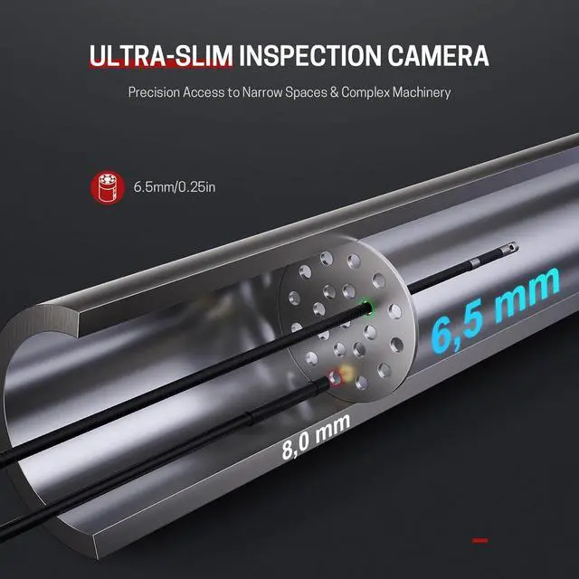 Ultra-Slim 6.2mm/0.24in Camera LensSlim 6.2mm borescope envisions the hard-to-reach places exquisite clearly for non-destructive testing. Easily fits into tight areas such as small pipes, ducts, and mechanical components