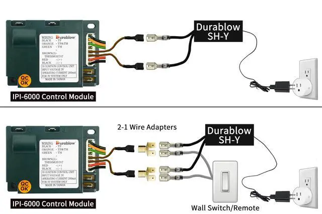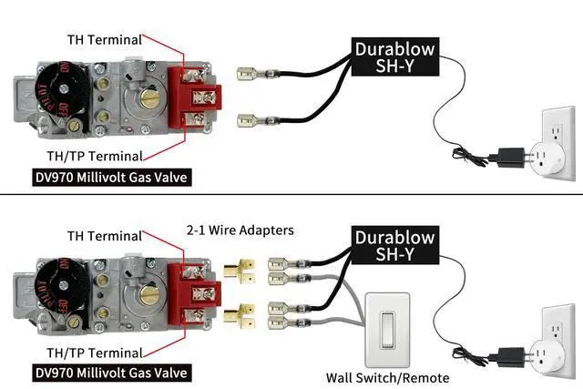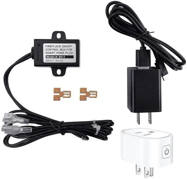 UPGRADE YOUR FIREPLACE IN MINUTES: This Durablow SH-Y control kit works with any Smart Plug Outlet (Included) and transforms your traditional gas fireplace into a smart home fireplace immediately. The package includes a power adapter, a 3' USB power cable, a control box module with two 3' leads, and two 2-1 wiring adapters. Compact and suitable for small spaces. VOICE-CONTROL YOUR FIREPLACE: Say "Alexa, Light my fireplace!", "Hey Google, fireplace on" or use other voice assistants to effortlessly control your gas fireplace, so that you can relax on the sofa, no more getting up and going to the wall switch. It is the ideal solution for your home automation solution. STRONG COMPATIBILITY: The Durablow SH-Y control kit is suitable for any brand of smart outlet plugs, and allows you to turn on or off the fireplace through Google Assistant, Alexa, HomeKit, or other smart applications (functions depending on your smart plug). Compatible with Millivolt safety pilot valve or electronic spark ignition gas appliances 593-592, IPI-6000. SIMPLE SETUP: Option (1) - Connect the Durablow SH-Y with the TH, TH/TP terminals on the Millivolt valve; Option (2) - Connect Durablow SH-Y with the BROWNS terminals from the fireplace IPI control module. *See images for connection options and reach out to us if unsure about compatibility. REMINDER: Smart Plug/Outlet is NOT included, please use your own one or buy individually. Durablow, as a fireplace remote control leading brand, provides other All-in-1 models such as SH3001, SH3002, SH4001, and SH4002, please search "Durablow Smart Fireplace Remote" on Amazon.