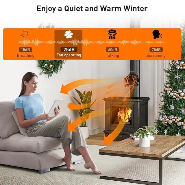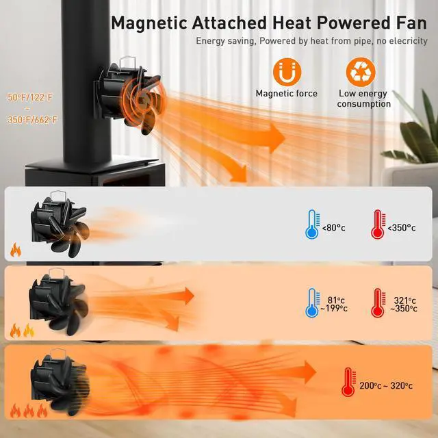 No Additional Running Costs: Heat powered - no batteries or electricity required, the stove fan is powered by heat from the fireplace or wood burning stove, the fireplace fan automatically adjusts its rotation speed with the temperature of the surface of the stove.