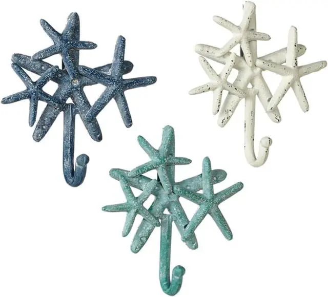 Measures 6 1/2 x 6 1/4 x 1 3/4 inches each. Made of painted cast iron with distressed finish. Two keyholes located on back of each for hanging. Mounting screws required for hanging (not included). Set of 3 includes one of each design, made by Midwest, imported