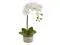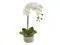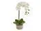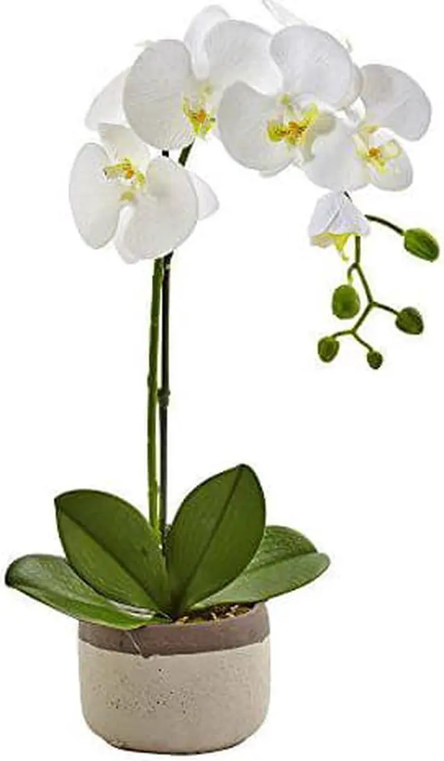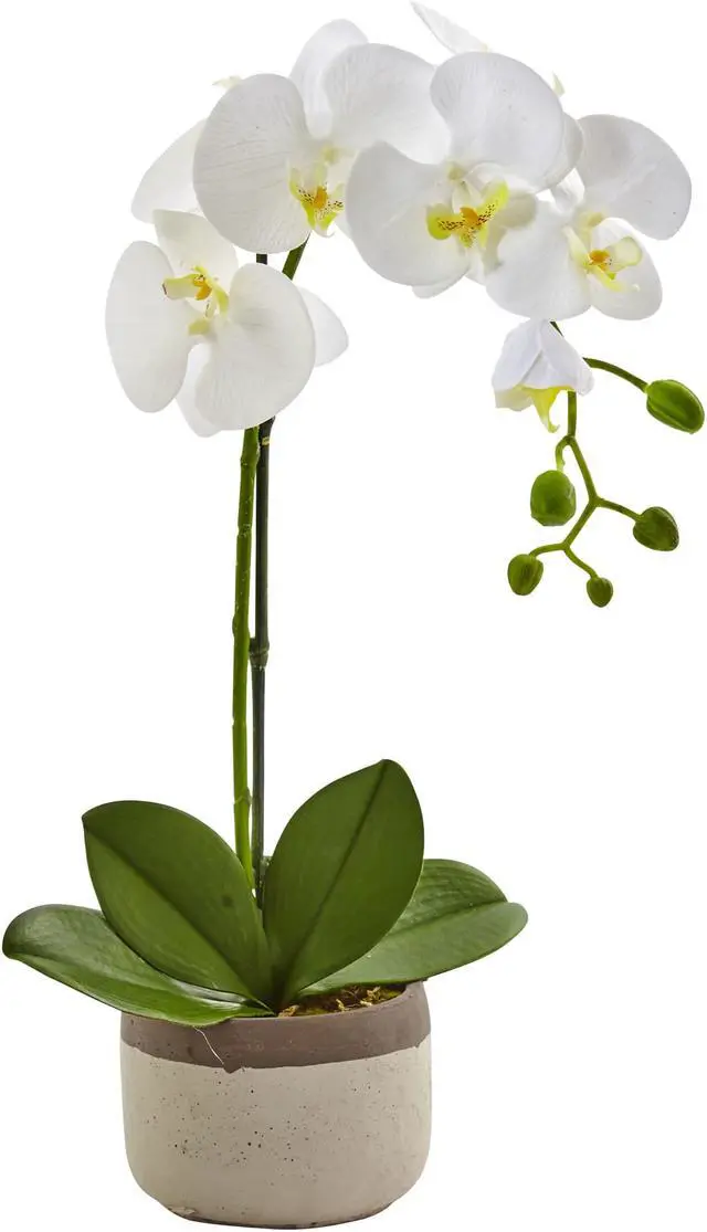 Elegant, blossoming petals drape gracefully from the Phalaenopsis Orchid. Simplistic, tiny buds and textured green petals give a realistic appearance. Place atop the vanity with glass jewelry dishes and candles for a feminine, classic look. Planter includes ceramic pot in neutral gray. Stands 19' tall.